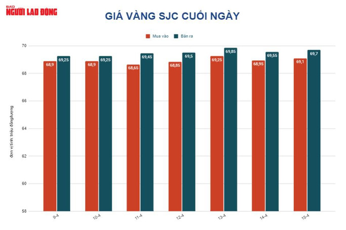 Lúc 8 giờ 30 ngày 16-4, giá vàng đối với SJC được các doanh nghiệp niêm yết mua vào 69,1 triệu đồng/lượng, bán ra 69,7 triệu đồng/lượng, tăng thêm 100.000 đồng mỗi lượng so với hôm qua.