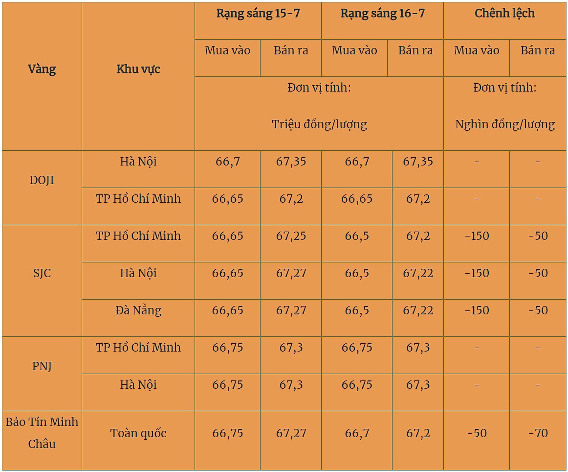 Giá vàng trong nước cập nhật lúc 5 giờ 30 sáng 16-7 như sau: