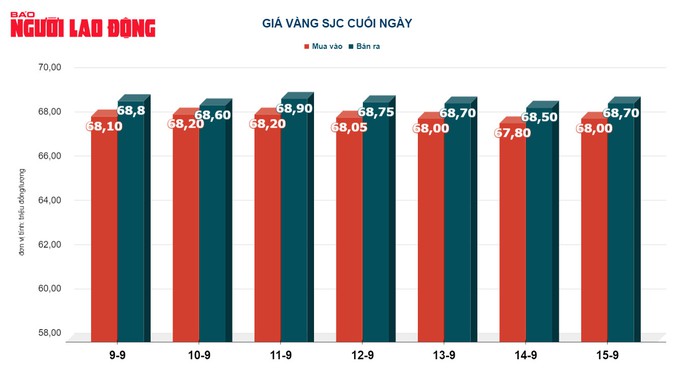 Tại Việt Nam, giá vàng SJC trong ngày 15-9 tăng 100.000 đồng/lượng, chốt cuối ngày tại 68,7 triệu đồng/lượng.