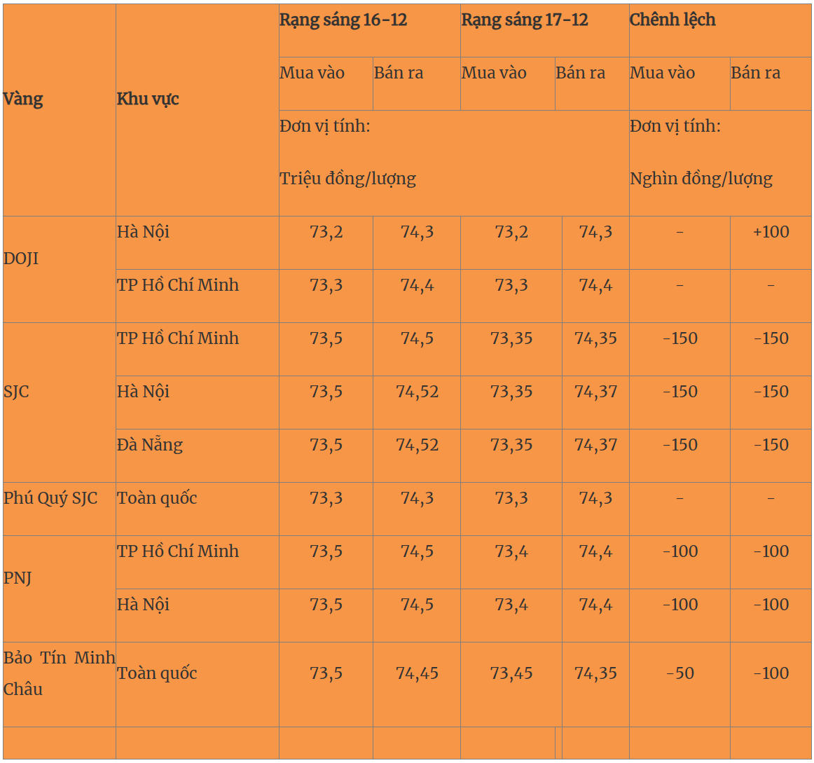 Giá vàng miếng trong nước cập nhật lúc 5 giờ 30 sáng 17-12 như sau:
