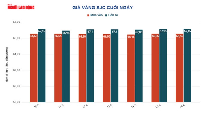 Trước đó, tại Việt Nam, giá vàng SJC trong ngày 16-6 giảm 50.000 đồng/lượng, chốt cuối ngày tại 67,15 triệu đồng/lượng.
