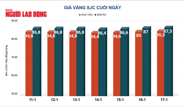 Trước đó, tại Việt Nam, giá vàng SJC cuối ngày 17-1 được các ngân hàng bán ra 87,3 triệu đồng/lượng. Công ty SJC bán ra vàng nhẫn với giá 86,7 triệu đồng/lượng.