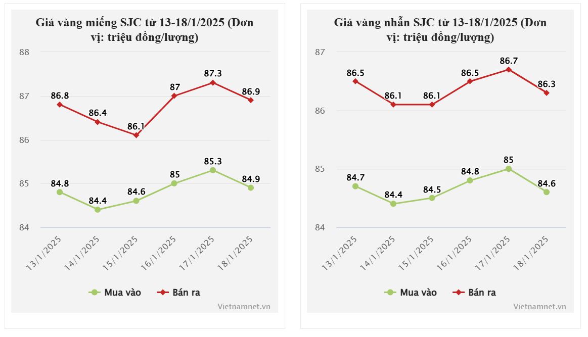 Kết phiên 18/1, giá vàng miếng tại SJC đóng cửa ở mức 84,9-86,9 triệu đồng/lượng (mua vào - bán ra), giảm 400 nghìn đồng/lượng ở cả chiều mua vào và bán ra so với kết phiên giao dịch hôm trước.