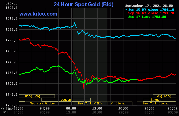 Trên thị trường vàng thế giới, giá vàng giao ngay chốt phiên tại Mỹ tăng 0,1 USD lên 1.753,8 USD/ounce. Giá vàng tương lai giao tháng 10 trên sàn Comex New York giảm 2,4 USD xuống 1.752,2 USD/ounce.