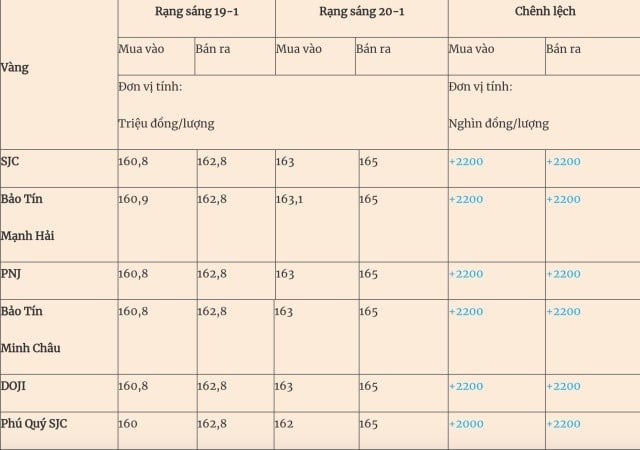 Giá vàng miếng trong nước cập nhật sáng 20-1 như sau: