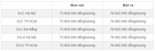 Mua vào Bán ra SJC Hà Nội 73.800.000 đồng/lượng 76.820.000 đồng/lượng SJC TP.HCM 73.800.000 đồng/lượng 76.800.000 đồng/lượng SJC Đà Nẵng 73.800.000 đồng/lượng 76.820.000 đồng/lượng DOJI Hà Nội 73.800.000 đồng/lượng 76.800.000 đồng/lượng DOJI TP.HCM 73.800.000 đồng/lượng 76.800.000 đồng/lượng.