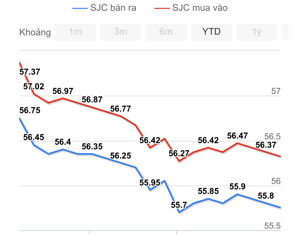 Công ty vàng bạc đá quý Sài Gòn niêm yết giá vàng SJC ở mức 55,75 triệu đồng/lượng (mua vào) và 56,42 triệu đồng/lượng (bán ra) tại Hà Nội. Giá vàng SJC tại TP.HCM, chiều bán ra là 56,4 triệu đồng/lượng.