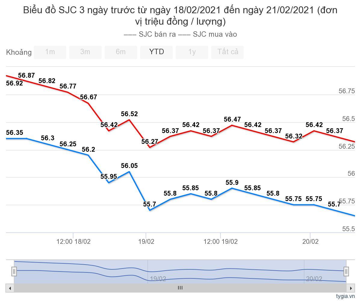 Mở cửa thị trường lúc 6h30 ngày 21/2, giá vàng miếng trong nước được Tập Đoàn Vàng bạc đá quý Doji niêm yết ở mức: 55,6 triệu đồng/lượng (mua vào) và 56,3 triệu đồng/lượng (bán ra), giảm 200 nghìn chiều bán ra so với ngày hôm qua.