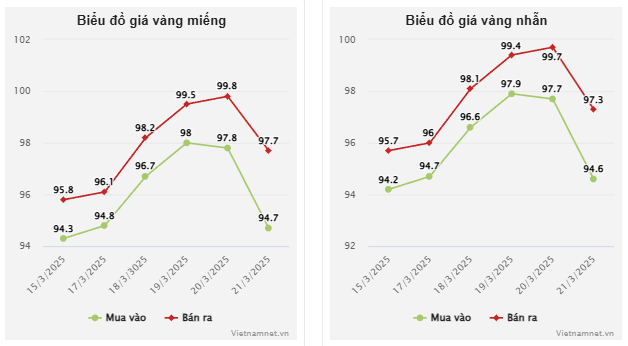 Kết phiên 21/3, giá vàng miếng tại SJC đóng cửa ở mức 94,7-97,7 triệu đồng/lượng (mua vào - bán ra), giảm 3,1 triệu đồng mỗi lượng ở chiều mua vào và hạ 2,1 triệu đồng mỗi lượng ở chiều bán ra so với kết phiên giao dịch hôm trước.