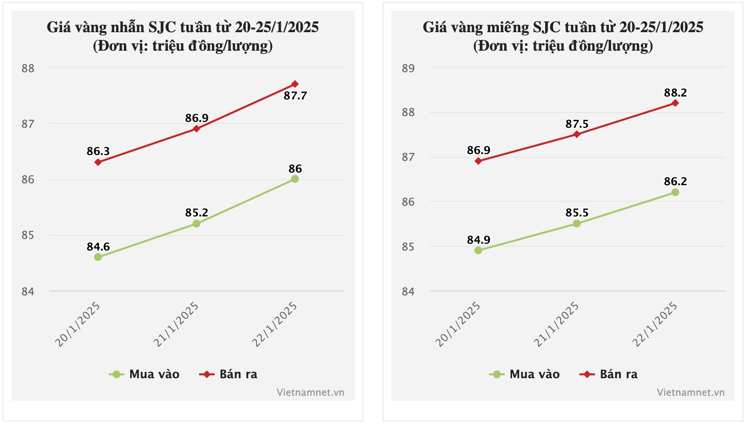 Tại thị trường trong nước, chốt phiên giao dịch ngày 22/1, giá vàng miếng 9999 tại SJC và Doji được niêm yết ở mức 86,2-88,2 triệu đồng/lượng (mua vào - bán ra), tăng 700.000 đồng so với phiên liền trước.
