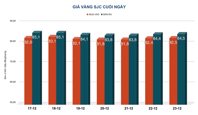 Tại Việt Nam, giá vàng SJC cuối ngày 23-12 được các ngân hàng bán ra 84,5 triệu đồng/lượng. Công ty SJC bán ra vàng nhẫn với giá 84,3 triệu đồng/lượng.