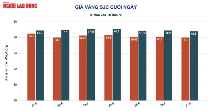 Cuối tuần 28-8, giá vàng SJC được các doanh nghiệp niêm yết mua vào 66,1 triệu đồng/lượng, bán ra 66,9 triệu đồng/lượng, ổn định so với hôm qua và chỉ giảm khoảng 200.000 đồng/lượng so với cuối tuần trước.