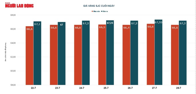 Tại Việt Nam, trong ngày 28-7, do sức mua - bán yếu nên giá vàng SJC gần như bất động tại 67,2 triệu đồng/lượng.