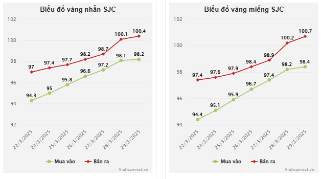 Kết phiên 29/3, giá vàng miếng tại SJC đóng cửa ở mức 98,4-100,7 triệu đồng/lượng (mua vào - bán ra), tăng 200.000 đồng/lượng ở chiều mua vào và đắt thêm 500.000 đồng/lượng ở chiều bán ra so với kết phiên giao dịch hôm trước.