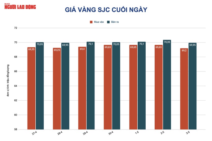 Trước đó, tuy giá vàng thế giới từ 9 giờ đến 17 giờ ngày 3-5 giảm nhưng do sức mua yếu, nên giá vàng SJC gần như "giậm chân tại chỗ", chốt cuối ngày tại 69,95 triệu đồng/lượng.