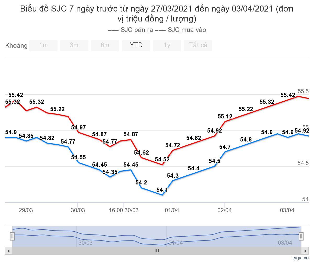 Mở cửa đầu tuần 29/3, giá vàng miếng trong nước được Tập Đoàn Vàng bạc đá quý Doji niêm yết ở mức: 54,9 triệu đồng/lượng (mua vào) và 55,4 triệu đồng/lượng (bán ra). Công ty vàng bạc đá quý Sài Gòn niêm yết giá vàng SJC ở mức 54,9 triệu đồng/lượng (mua vào) và 55,4 triệu đồng/lượng (bán ra) tại Hà Nội. Giá vàng SJC tại TP.HCM, chiều bán ra là 55,42 triệu đồng/lượng.