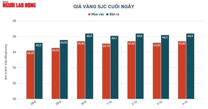 Trước đó, từ 9 giờ đến 17 giờ ngày 4-10, do sức mua trong nước yếu nên trong khoảng thời gian này, giá vàng SJC giảm 100.000 đồng/lượng, chốt cuối ngày tại 66,4 triệu đồng/lượng.