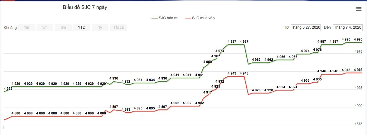 Giá vàng trong nước đầu giờ chiều 1/7 đã lên tới 49,8 triệu đồng/lượng (bán ra), trong khi giá mua vào cũng đã đạt 49,4 triệu đồng. So với cuối giờ chiều 30/6, giá vàng tăng 400.000-430.000 đồng/lượng ở cả hai chiều mua vào và bán ra. So với cách đây 1 tuần, giá vàng trong nước đã tăng khoảng 800.000 đồng/lượng. Tính từ đầu năm, vàng SJC đã tăng khoảng 5,5 triệu đồng/lượng.