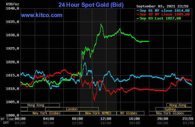 Trên thị trường vàng thế giới, giá vàng giao ngay chốt phiên tại Mỹ tăng 18 USD lên 1.827,6 USD/ounce. Giá vàng tương lai giao tháng 10 trên sàn Comex New York tăng 18,3 USD lên 1.827,7 USD/ounce.