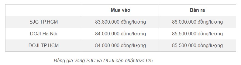 Trưa ngày 6/5, giá vàng 9999 của SJC giảm thêm 100 nghìn đồng/lượng ở cả chiều mua vào và bán ra, mất mốc 86 triệu đồng/lượng (bán ra).