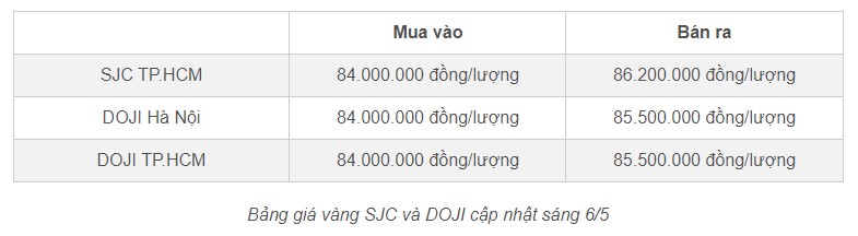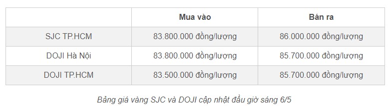 Đầu giờ sáng 6/5, giá vàng 9999 của SJC tăng 300 nghìn đồng/lượng ở chiều mua vào và tăng 100 nghìn đồng/lượng ở chiều bán ra so với kết phiên giao dịch cuối tuần qua, lên mức 86 triệu đồng/lượng (bán ra).