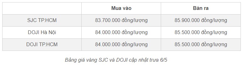 Doji Hà Nội niêm yết ở mức 83,5 triệu đồng/lượng (mua vào) và 85,7 triệu đồng/lượng (bán ra). Doji TP.HCM mua vàng SJC ở mức 83,5 triệu đồng/lượng, bán ra ở mức 85,7 triệu đồng/lượng.