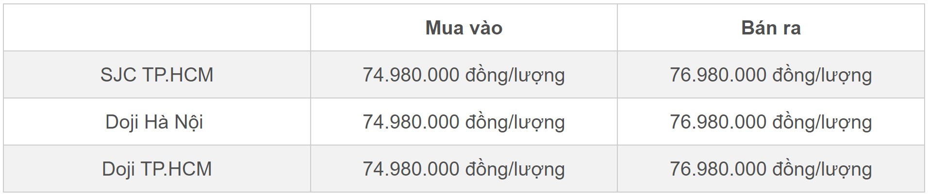 Mua vào Bán ra SJC TP.HCM 74.980.000 đồng/lượng 76.980.000 đồng/lượng Doji Hà Nội 74.980.000 đồng/lượng 76.980.000 đồng/lượng Doji TP.HCM 74.980.000 đồng/lượng 76.980.000 đồng/lượng