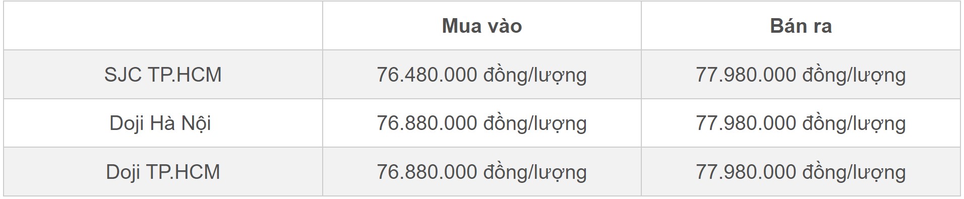 Mua vào Bán ra SJC TP.HCM 76.480.000 đồng/lượng 77.980.000 đồng/lượng Doji Hà Nội 76.880.000 đồng/lượng 77.980.000 đồng/lượng Doji TP.HCM 76.880.000 đồng/lượng 77.980.000 đồng/lượng
