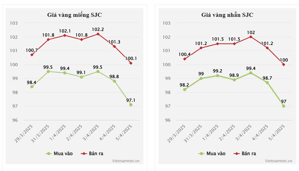Kết phiên 5/4, giá vàng miếng tại SJC đóng cửa ở mức 97,1-100,1 triệu đồng/lượng (mua vào - bán ra). Giá vàng nhẫn loại 1-5 chỉ của SJC được niêm yết ở mức 97-100 triệu đồng/lượng (mua - bán). Còn giá vàng nhẫn 9999 tại Doji chốt phiên ở mức 96,7-100,1 triệu đồng/lượng.