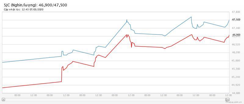 Chốt phiên giao dịch cuối tuần ngày 7/3, giá vàng miếng trong nước được Tập Đoàn Vàng bạc đá quý Doji niêm yết ở mức: 46,7 triệu đồng/lượng (mua vào) và 47,2 triệu đồng/lượng (bán ra).
