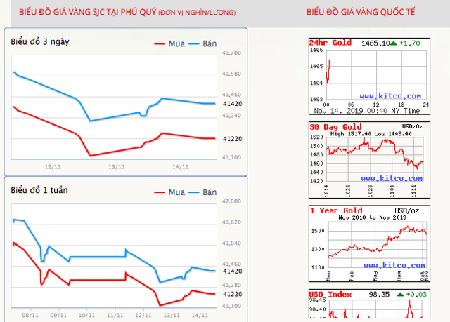Trước đó, vào đêm ngày 13/11, giá vàng thế giới thế giới giao ngay đứng ở mức 1.459 USD/ounce, trong khi giá vàng giao tháng 12/2019 trên sàn Comex New York đang đứng ở mức 1.461 USD/ounce.