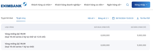 Trong vai người có nhu cầu bán vàng miếng SJC, chiều 30-10, phóng viên liên hệ một chi nhánh Eximbank ở TP Thủ Đức (TP HCM), nhân viên giao dịch ở đây cho biết khách có thể tới bán vàng miếng SJC loại 1 lượng, theo giá niêm yết tại thời điểm giao dịch. Riêng mua vàng miếng SJC, ngân hàng sẽ ghi nhận nhu cầu của khách hàng, nếu có sẵn nguồn vàng sẽ bán cho khách.