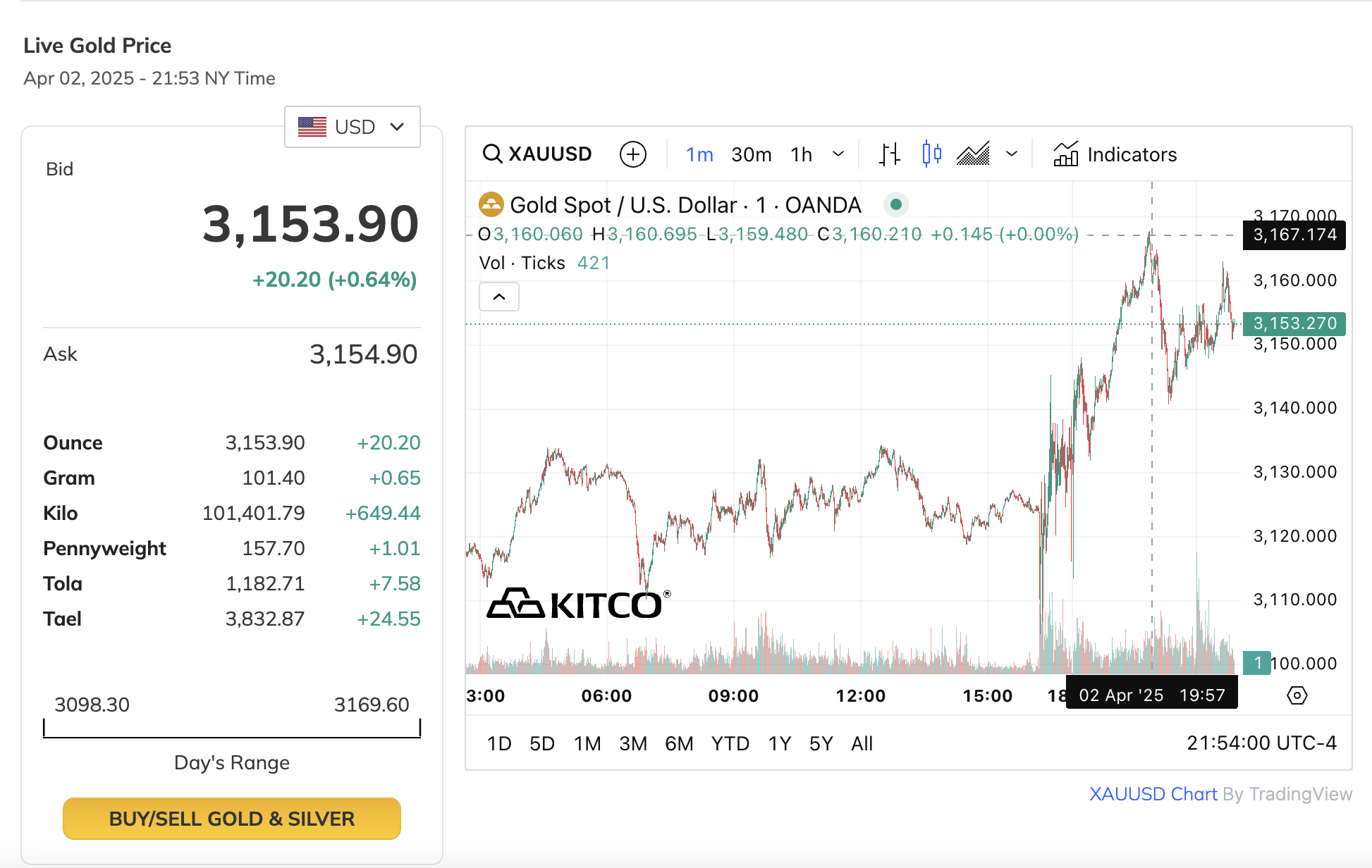 Giá vàng tăng dựng đứng sau thông tin Tổng thống Mỹ Donald Trump công bố áp thuế đối ứng ồ ạt lên tất cả hàng hóa nhập khẩu vào Mỹ ở các quốc gia, trong đó có Việt Nam.