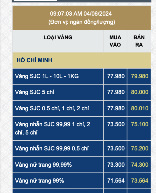 Khoảng 10 giờ sáng nay, Ngân hàng Nhà nước công bố giá bán vàng miếng SJC cho 4 ngân hàng thương mại và Công ty vàng bạc đá quý Sài Gòn (công ty SJC) là 77,98 triệu đồng/lượng, giảm thêm 2 triệu đồng/lượng so với hôm qua.
