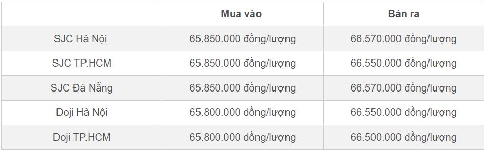Tuy nhiên, tới cuối buổi chiều nay, giá vàng miếng của SJC tại Hà Nội bật tăng lên mốc 65,85-66,57 triệu đồng/lượng. Còn giá vàng miếng của Doji tại Hà Nội vào chiều nay giữ nguyên ở chiều mua vào và tăng 50 nghìn đồng/lượng ở chiều bán ra; giá vàng miếng của Doji tại TP.HCM đứng yên so với buổi sáng.