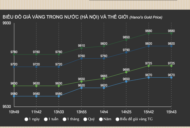Tuy nhiên, chỉ sau vài phút mở cửa giao dịch, Bảo Tín Minh Châu tiếp tục đẩy giá vàng miếng và vàng nhẫn 24K của công ty này lên mức kỷ lục mới, 99,2 triệu đồng/lượng bán ra và 97,65 triệu đồng/lượng mua vào.