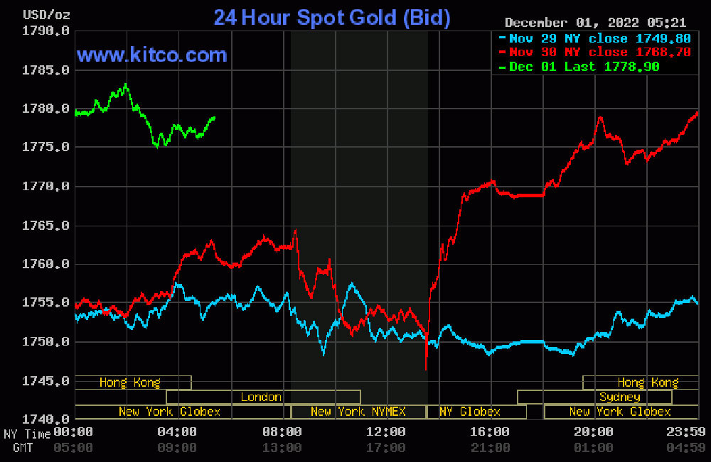 Trên thị trường thế giới, giá vàng hôm nay bật tăng sau bài phát biểu của Chủ tịch Fed về khả năng nâng lãi suất chậm lại. Vào lúc 17h11' ngày 1/12 (giờ Việt Nam), giá vàng giao ngay ở mốc 1.778,2 USD/ounce, mức cao nhất trong 2 tuần qua.