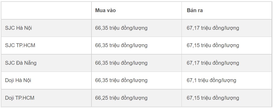 Mở cửa thị trường hôm nay (ngày 1/12), giá vàng miếng của Công ty TNHH MTV Vàng bạc đá quý Sài Gòn (SJC) niêm yết tại Hà Nội ở mốc 66,6-67,42 triệu đồng/lượng (mua vào - bán ra), tăng 100 nghìn đồng/lượng ở chiều mua vào và bán ra so với kết phiên hôm qua.