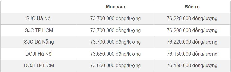 Đầu giờ sáng nay, Công ty TNHH MTV Vàng bạc đá quý Sài Gòn (SJC) hạ giá vàng miếng 500.000 đồng/lượng ở cả chiều mua vào và bán ra so với kết phiên hôm qua, kéo giá bán ra về mức 76 triệu đồng/lượng.