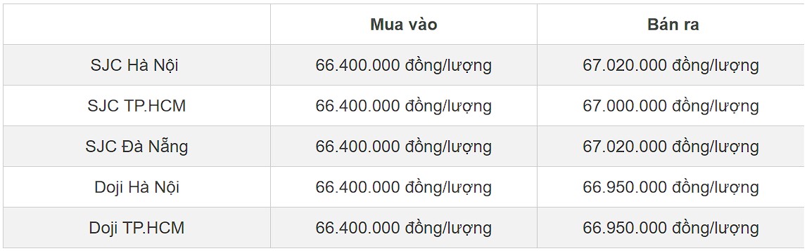 Còn giá vàng miếng của Tập đoàn Vàng bạc đá quý Doji tại Hà Nội không đổi; giá vàng miếng của Doji tại TP.HCM tăng 50 nghìn đồng/lượng ở chiều mua vào và giữ nguyên ở chiều bán ra so với chốt phiên hôm qua.