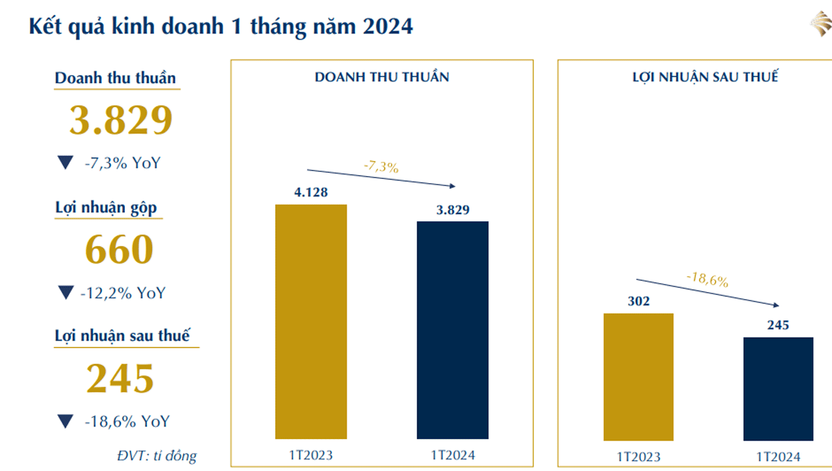 Theo đó, trong tháng 1, PNJ ghi nhận doanh thu thuần đạt 3.829 tỷ đồng, giảm hơn 7% so với cùng kỳ năm trước. Lợi nhuận sau thuế giảm 18,6% xuống 245 tỷ đồng.