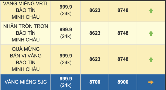 Giá vàng nhẫn cũng có sự cách biệt giữa các thương hiệu. Công ty PNJ niêm yết giá vàng nhẫn mua vào 86,1 triệu đồng/lượng, bán ra 87,1 triệu đồng/lượng. Tập đoàn DOJI bán ra vàng nhẫn trơn ở mức 87,2 triệu đồng/lượng, trong khi Công ty Bảo Tín Minh Châu giao dịch lên tới 86,23 triệu đồng/lượng mua vào, 87,48 triệu đồng/lượng bán ra.
