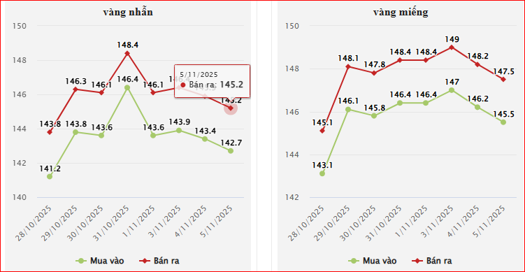 Trong nước, giá vàng miếng SJC và vàng nhẫn tiếp tục giảm theo đà thế giới. Cuối phiên 5/11, vàng miếng SJC giao dịch ở 145,5-147,5 triệu đồng/lượng, giảm 700.000 đồng/lượng so với phiên trước, vàng nhẫn Doji giảm 1,5 triệu đồng. Mức chênh lệch giữa giá vàng trong nước và thế giới thu hẹp còn khoảng 20 triệu đồng/lượng.