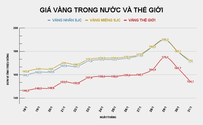 Thị trường vàng trong nước tiếp tục chứng kiến cú rơi mạnh khi giá vàng miếng SJC sáng 31-1 giảm sâu thêm hàng triệu đồng mỗi lượng. Các doanh nghiệp kinh doanh vàng niêm yết giá mua vào 169 triệu đồng/lượng và bán ra 172 triệu đồng/lượng, giảm 9 triệu đồng so với hôm qua.
