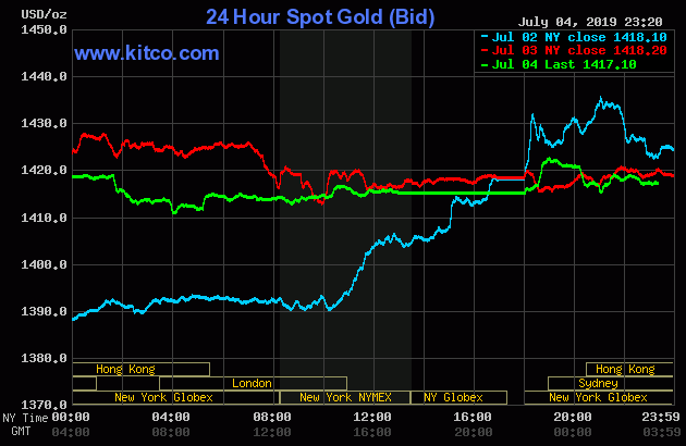 Cùng thời điểm, giá vàng giao ngay trên sàn Kitco đang giao dịch ở mức 1.417 USD/ounce, giảm 1,2 USD, tương đương 0,08% so với chốt phiên trước.