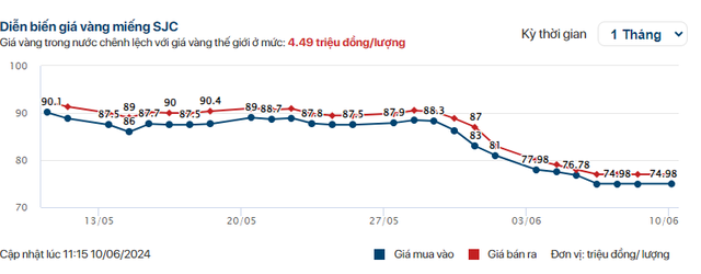 Đến ngày 3/6, ngày đầu tiên các ngân hàng thương mại Nhà nước bán vàng trực tiếp cho người dân, giá vàng giảm về quanh mốc 80 triệu đồng/lượng. Và sau một tuần các nhà băng mở bán vàng miếng theo chỉ đạo của Ngân hàng Nhà nước (NHNN) nhằm bình ổn thị trường vàng, đến nay, giá vàng miếng SJC trong nước đã giảm hơn 6 triệu đồng/lượng.