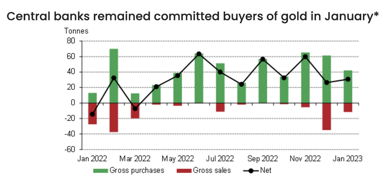 Theo Hội đồng Vàng Thế giới (WGC), ngân hàng trung tương tiếp tục mua vàng từ đầu năm 2023. Trong tháng 1, giá vàng tăng từ 1.860 USD/ounce lên mức cao nhất khoảng 1.960 USD/ounce.