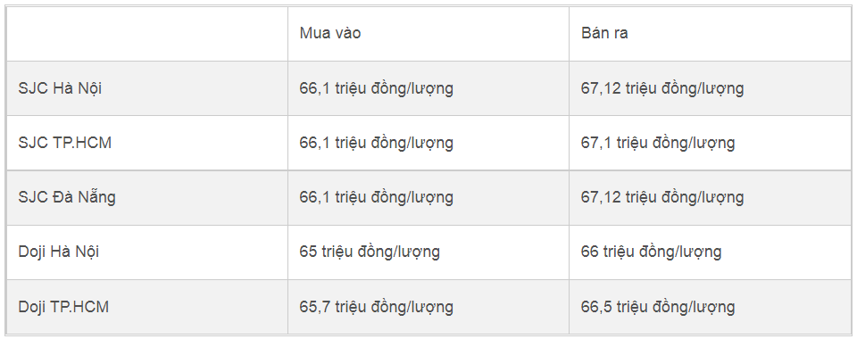 Mua vào Bán ra SJC Hà Nội 66,1 triệu đồng/lượng 67,12 triệu đồng/lượng SJC TP.HCM 66,1 triệu đồng/lượng 67,1 triệu đồng/lượng SJC Đà Nẵng 66,1 triệu đồng/lượng 67,12 triệu đồng/lượng Doji Hà Nội 65 triệu đồng/lượng 66 triệu đồng/lượng Doji TP.HCM 65,7 triệu đồng/lượng 66,5 triệu đồng/lượng