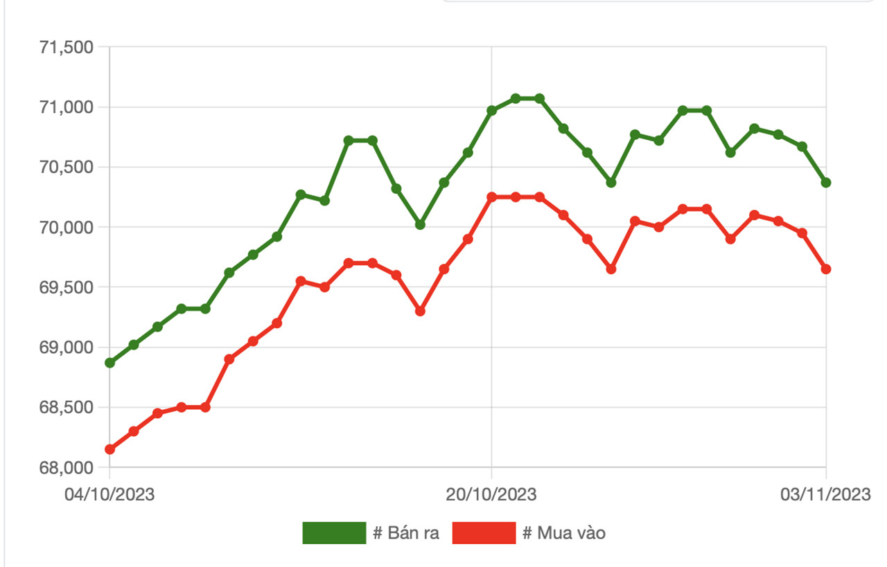 Đầu tháng 11, giá vàng SJC ít biến động nhưng vẫn ở mức cao. Chốt phiên 3/11, giá vàng miếng 9999 tại SJC TP.HCM là 69,65 triệu đồng/lượng (mua vào) và 70,35 triệu đồng/lượng (bán ra). SJC Hà Nội niêm yết ở mức 69,65 triệu đồng/lượng (mua vào) và 70,37 triệu đồng/lượng (bán ra).