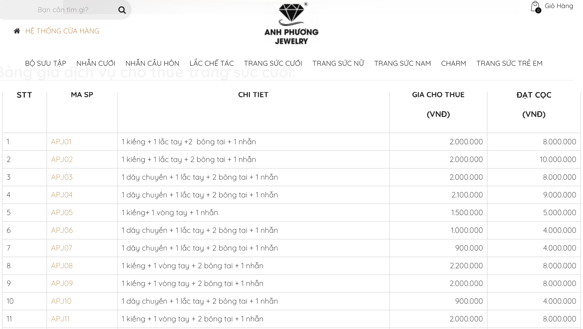 Ngoài ra, cũng có không ít đơn vị công khai bảng giá trên website. Công ty TNHH Thương mại Vàng bạc Đá quý Anh Phương cho thuê vàng cưới với mức giá từ 900.000 đồng - 2,2 triệu đồng một ngày (trả trước 12h ngày hôm sau) với mức tiền cọc 8 - 10 triệu đồng tùy theo bộ trang sức mà khách lựa chọn.
